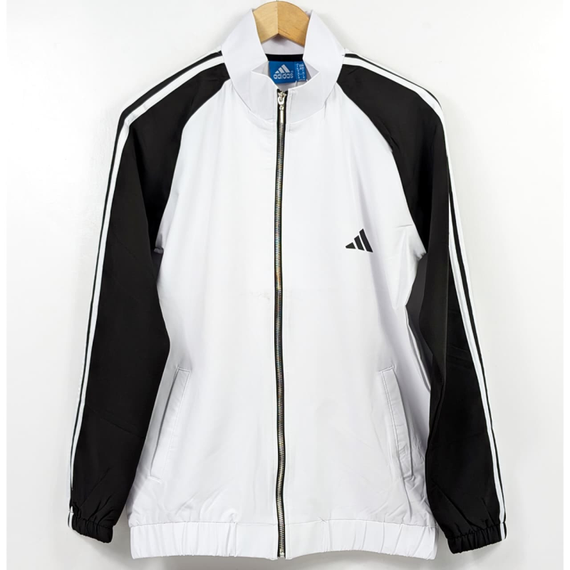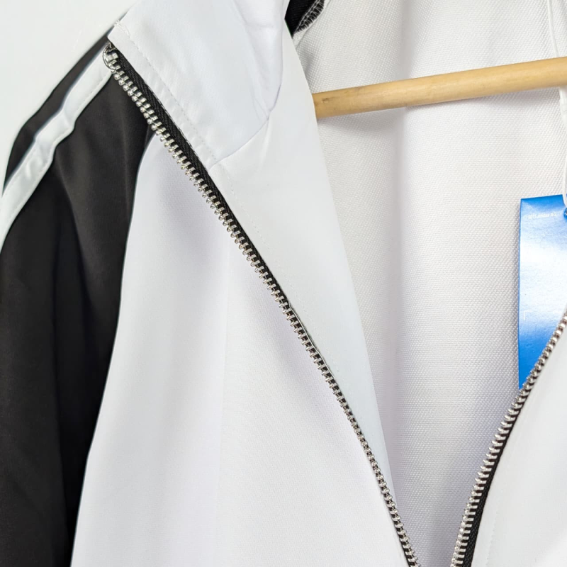 Elevate your everyday style with the Adidas Casual Track Jacket, a timeless blend of sport and streetwear heritage. This jacket channels the legacy of Adidas with a crisp white body contrasted by bold black sleeves, accented by the iconic three-stripe design that runs from shoulder to wrist—a symbol of athletic excellence since the 1970s.